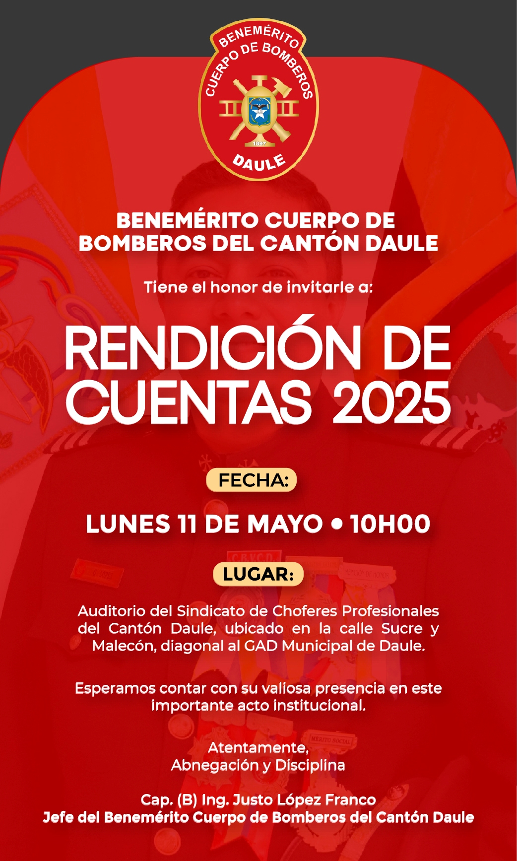 con 20 años de trayectoria y entrega a la abnegada institución Bomberil fue posesionado como Jefe del Benemérito Cuerpo de Bomberos de Daule. El Capitán Bomberil inició su carrera como Voluntario desde el año 2002, destacándose siempre por su compromiso, predisposición, constancia y dedicación.